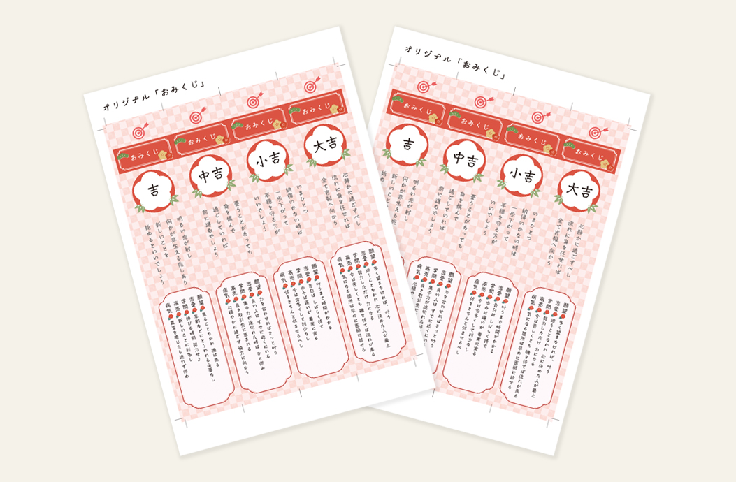 イベントグッズとして『オリジナル おみくじ』はいかがでしょう? 薄くて柔らかい純白ロールなら、細かく折っても、巻いてロール状にしても比較的キレイに仕上がります。 趣向を変えて、カプセルトイ風のアレンジもオススメです。 薄紙で遊び心のあるグッズを製作してはいかがでしょうか。